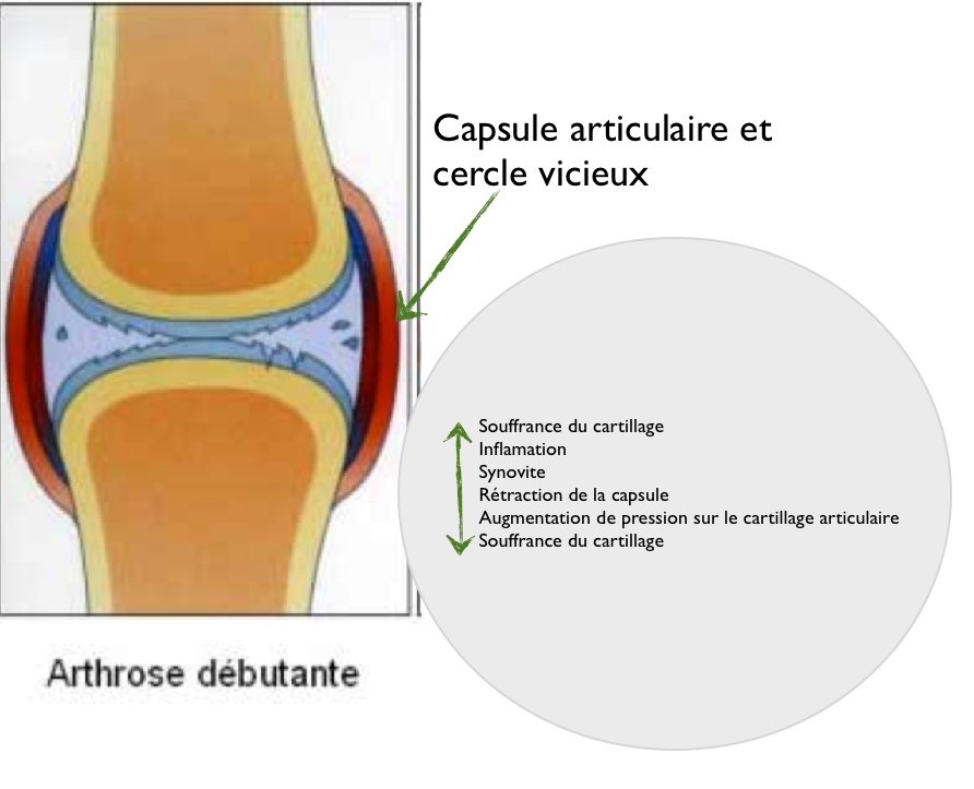 Une articulation qui souffre d’arthrose s’enraidit, mais toute velléité de gagner activement de l’amplitude risque d’agresser la synoviale et de provoquer une inflammation qui va agresser le cartilage dont la souffrance va provoquer une rétraction de la capsule = cercle vicieux.