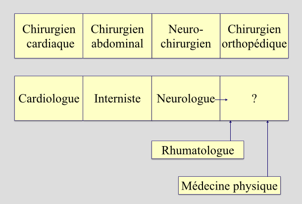 Et personne ne s’alarme que l’orthopédie soit la seule branche de la médecine qui ne forme pas d’orthopédiste non-chirurgien à l’image du cardiologue, de l’ORL, du neurologue… Voir ci-dessous :