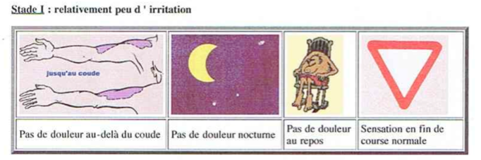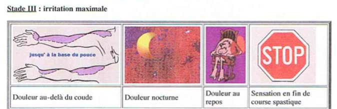 Je n’ai pas de douleurs la nuit (sauf si je me suis couchée sur le bras concerné),ni au repos.Les douleurs sont surtout au niveau du biceps,depuis la séance d’ostéopathie les irradiations vers la main sont moins fréquentes (elles concernaient plus le dos de la main que la base du pouce). Donc je ne reconnais pas vraiment un stade 3.