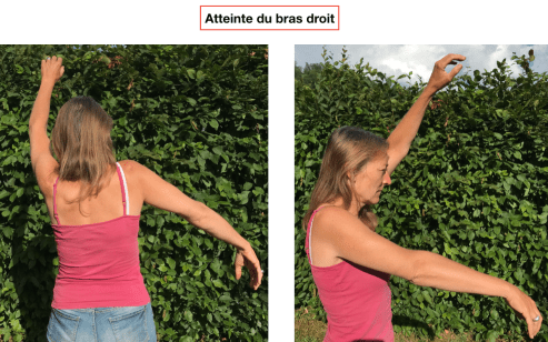 Je ne peux toujours pas lever mon bras derrière mon dos. Une séance d’ostéopathie m’a fait gagner quelques cm d’amplitude, mais les mouvements derrière le dos ou l’étirement vertical du bras sont toujours très difficiles (raideur) et douloureux.