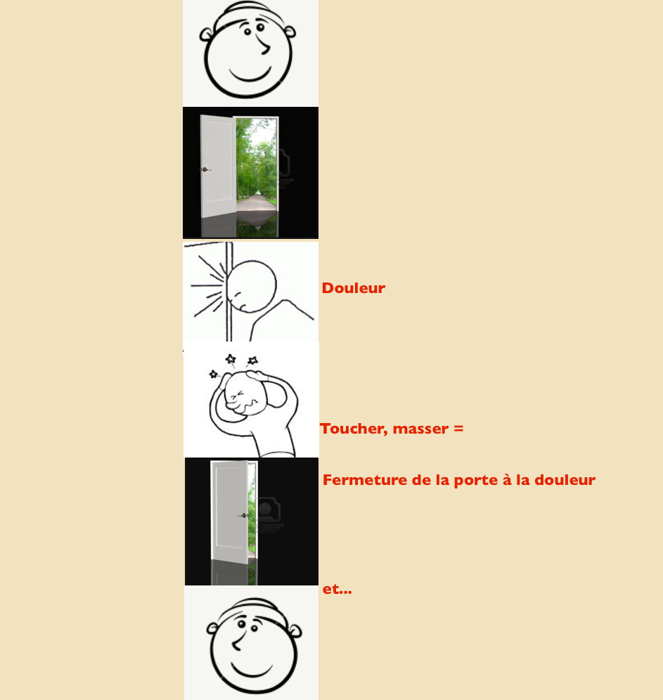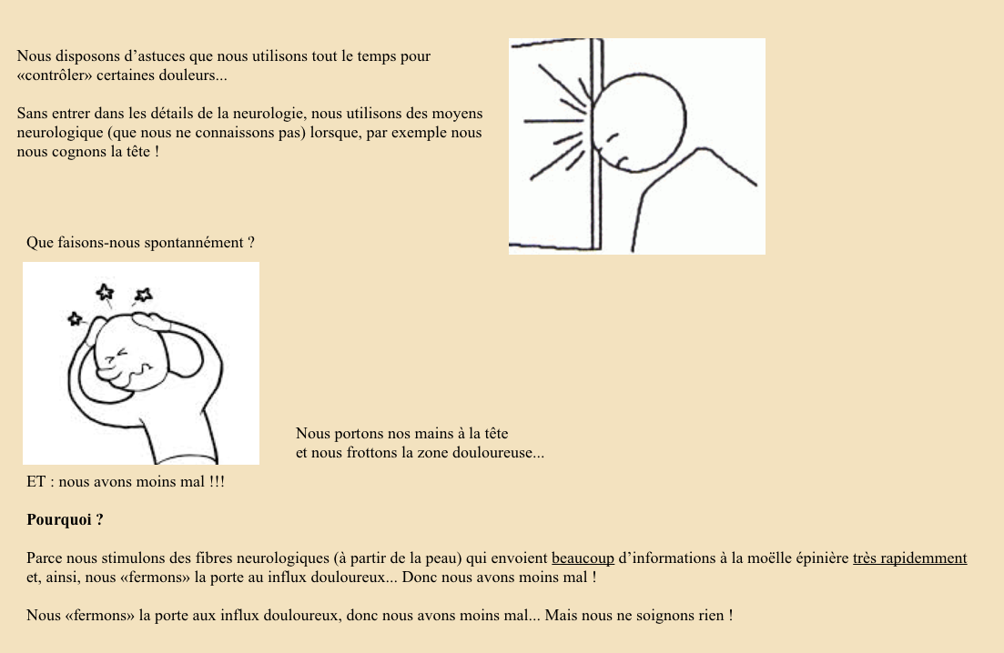 Capture d’écran 2013-10-12 à 08.54.09Capture d’écran 2013-10-12 à 09.11.38Le frottement, le chaud, le froid, l’acupuncture ont un effet sur la douleur, mais pas sur la cause de la douleur. C’est donc simplement une question de piège neurologique : fermeture au niveau de la moelle épinière de la porte qui permet à la douleur d’entrer.